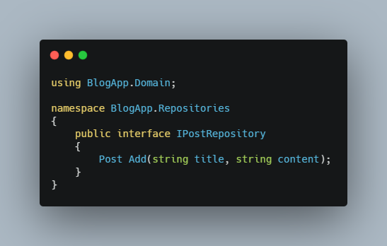 No projeto BlogApp, agora serão definidas duas interfaces correspondentes a um serviço e um repositório, chamados respectivamente de IPostService e IPostRepository. Também é criada a classe que implementa o IPostService. Apenas um método é implementado, o Create, que recebe dois campos de texto: title e content.