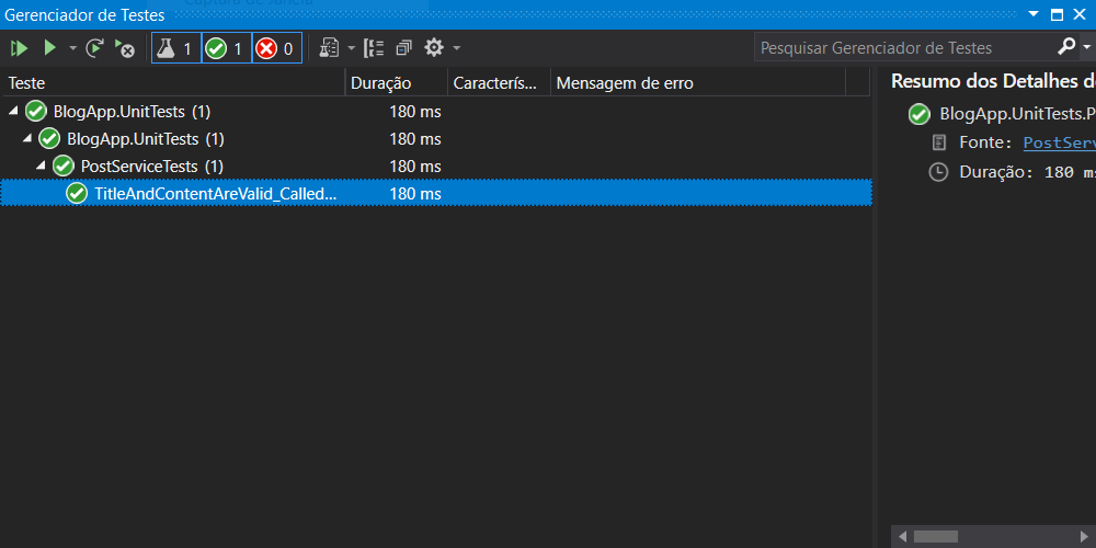 Com o código a ser testado devidamente implementado, é criada uma classe de teste, no projeto BlogApp.UnitTests, chamada PostServiceTests. Seguindo o padrão AAA (Arrange, Act, Assert), e o padrão de nomenclatura Given_When_Then, crio o método de teste abaixo.